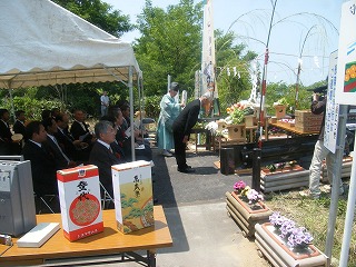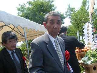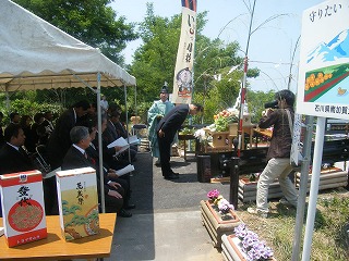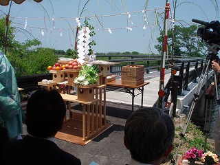 「前川あおぞら橋」の竣工式 三法に乗りきらないほどの地物の 桃太郎トマトは箱ごと積まれました そのほかにもきゅうり、小松菜など 地物の幸が所狭しと並べられました |