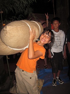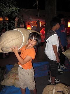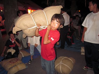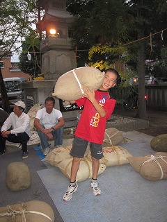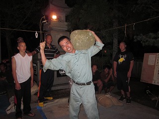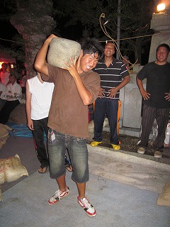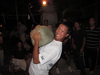 まずは子供達が挑戦!! 「力石」はいろいろな重さ があり自分に見合った物を 選ぶことができます |