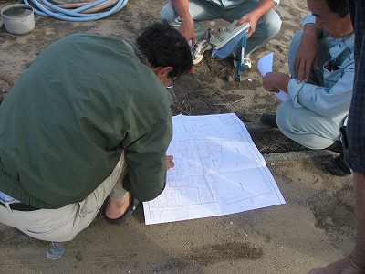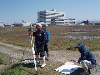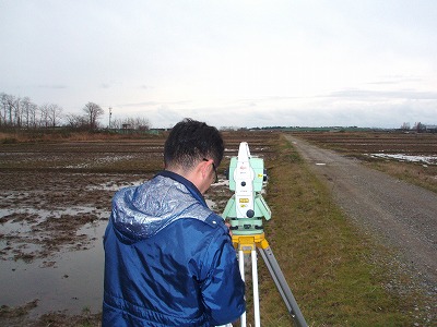 境界は国交省の街区基準点 を基に正確に測量しています (裏田の測量中!) |