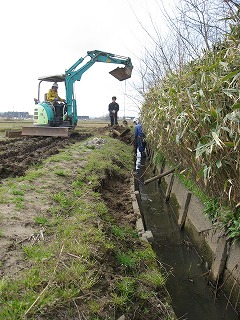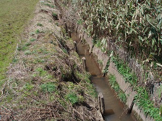 前川堤防横排水路 溝畔が崩れていて増水 による吸出しが起こり 農地の土が排水路へ 流れ出てしまいます |
