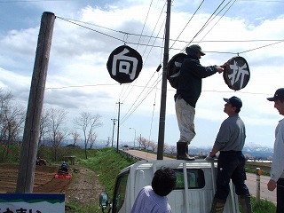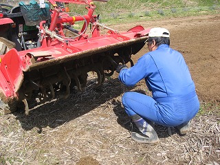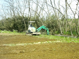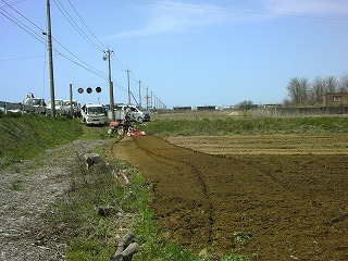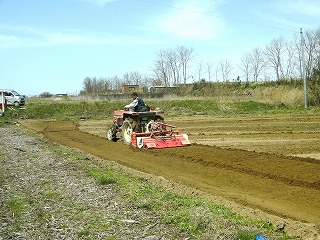 トラクターで整地作業開始 「わし こっちからするわ」 「おっしゃ わしゃこっちや」 |