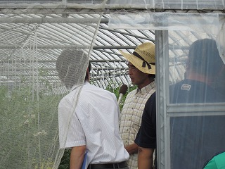 酷暑の中での栽培の苦労や 工夫などを質問されました 日頃はテレ屋なK氏ですが トマトのこととなると 立て板に水のように・・・ |