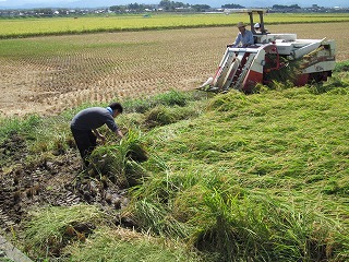 コンバインがきちんと 刈り取っていくよう 風や雨で倒れた稲を 起こす作業は人間の 手でするしかありません |