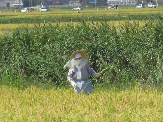 稲刈りしている上を戦闘機が 通過して行きました |